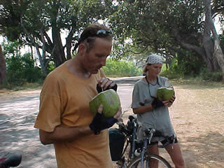 | Nice, refreshing roadside break! Green coconuts are filled with sweet water and jelly-like meat! | |