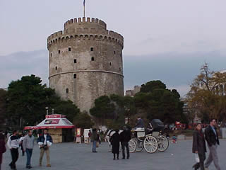 I'm currently in Thessaloniki, the 3rd largest city in Greece, enjoying a day's break from the road by eating greasy food (imagine that!) and watching an American movie with Greek subtitles. Sitting here in an ultra-modern Internet cafe, I'm surrounded by rabid (and I mean RABID!) soccer fans watching the big-screen game and screaming at their team, all trying desperately to drown out the already loud stereo, while I try to compose my thoughts in some coherent manner. Rots of ruck... Speaking of greasy food, I weighed myself on some scales in the Athens train station - I've GAINED 2 pounds since setting out on this deal. Gotta get to a country quick where meat and olive oil don't figure so big in the cuisine. I ate a couple of Chinese meals in Athens - it was a nice break, but I still couldn't get away from the salt level. It ranks right behind feta cheese as the most used condiment here. Thessaloniki is a coastal city in the Northwest of the country, halfway between Athens and Istanbul, as the bike rides. It dates back to 315BC and is named after Alexander the Great's sister. Beautiful place, it also has a very modern flavor, owing to a massive fire in 1917 that destroyed much of the city, and then an earthquake in 1978 that damaged most of the monuments and churches. The White Tower, pictured below, was the scene of a massacre of the Sultan's personal guards who'd revolted against Mahmoud II and were imprisoned here in 1826. It became known as Bloody Tower because of this, and the turks decided to suppress it by whitewashing and renaming it the White Tower. I got here from Athens by taking the train for the first half of the journey here, in order to save a little time. This got me back up to approximately the longitude I'd started at in Greece (so I'm not REALLY cheating, ok?), and then I rode the second half into Thessaloniki at a record pace for me (a screaming 23 kph average!) If I keep this pace up, I should be done by, oh I don't know, May? I got so used to the hard, hard 60 km days in the Greek mountains that the 90+ km days of this week have been a shock. I think I'll be out of Greece and into Turkey within a week if all goes well, which is only a week longer than what I'd thought I'd take in Greece anyway. This city is really fashionable - the waterfront cafes are simply packed with all the beautiful people in the evening - and this suits me just fine, although only by coincidence. I'd decided after having walked around the previous place on a Saturday evening, that I was tired of looking like such an obvious damn tourist in my shorts and sandals. NO Greeks wear shorts or sandals in November! (Not even other tourists for that matter, but then they aren't from Montana and traveling by bike!) I mean I get looks from people sometimes that make me wanna check the mirror to make sure somebody didn't slip Hawaiian-print bermuda shorts and calf-high black socks on me when I wasn't looking. And nylon hiking pants and a nappy fleece jersey aren't much more stylish. I can't believe I actually went to a Sicilian nightclub wearing that stuff. So tomorrow I'm going shopping for shoes, jeans, a shirt and matching (matching!) jacket - something I can wear out at night and not have people automatically speak English to me. Or look at me like I've insulted their heritage and offended their eyesight just by dressing like that in their presence. Where I'll store the new stuff on the bike I haven't decided yet. I've been making a list of less-used items that I can mail back or just plain not carry in order to make room. Like food and water (yes, I'm that desperate). So, we'll see what I can find in the shops tomorrow. Of course with my fashion sense, its likely to be very expensive Hawaiian-print bermuda shorts with dark socks... Though speaking of good taste, its not too uncommon for me to see a young woman wearing an outfit that might include TIGHT dark purple nylon pants and maroon leather jacket garnished with a pinkish scarf. It looks a bit like a slender eggplant wearing a pink wig being being slowly squeezed into a can of grape Nehi. (Aaw, hell, its the best I could come up with - you'd have to see it...) On the train from Athens, I got into a conversation with a young Greek girl and, as we had 6 hours to blow, we covered a load of different philosophical terrain, ranging from materialism to politics to America's global role. I'm fascinated by the opinions of non-Americans on how America involves itself in the world, or at least on how they perceive us to be involved. Since other country's opinions, especially when about us, don't usually get much air time at home, up to now I'd only heard bits and pieces in that vein regarding our role in Yugoslavia. I knew that our military involvement wasn't necessarily popular worldwide, but its still an eye-opener to speak directly with someone who believes that America was in the wrong. I happen to disagree with her, but it was very interesting to hear that sentiment expressed, and surprising to see how strongly she felt it. I'm continuing my current trend of staying in the worst (read: cheapest) possible hotel I can find in any town, particularly now that the weather is starting to get damn cold for camping. I mean I can hardly take my shirt off during the day anymore - how'm I gonna maintain my tan? And I could've sworn I saw a cloud behind me out of the corner of my eye this afternoon. But by the time I turned around for a better look, it had evaporated. So my place for tonight, and probably for tomorrow night unless the rats carry me off, costs $11. This isn't much more than for camping, and I get the added security of a locked room for my stuff while I ramble around. It might be a false sense of security however, as just about every room I've taken in the past month uses the same simple key, I swear. This place is such a hole that after the owner quoted me $16 for a night, he almost immediately came down in price without me even having to bargai