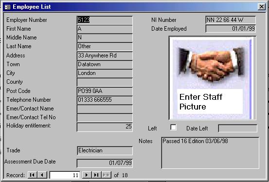 A Personnel database allows you to maintain records concerning your staff. This system, like the rest of the databases may be linked, for example you may wish to link the personnel database to the health and safety database to monitor staff exposure levels (COSHH Regs).