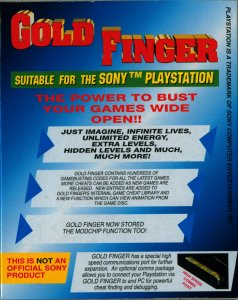 The Gold Finger Game Enhancer 2M is essentially a GameShark and modchip combined into one external unit. Unlike an internal modchip, the Game Enhancer does not void the warranty of the PlayStation.