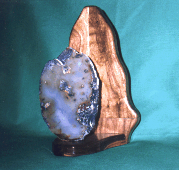 Creamy agate with flecks of black, rust and gold colors on large base of "swirled grain" walnut burl with tall back.
