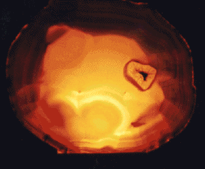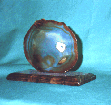 Very colorful agate with crystal highlights on intricately patterned walnut burl base.