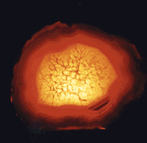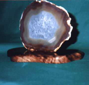 Crystaline centered agate with concentric circles of color on free-form base of delicately patterned walnut burl.
