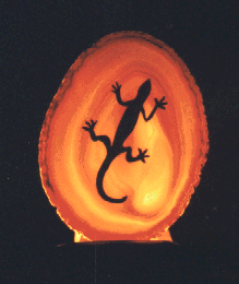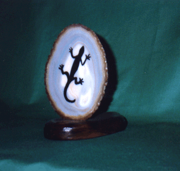 Gecko climbing to the top of a creamy agate with fiery highlights from a teardrop shaped base of walnut burl.