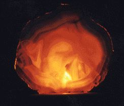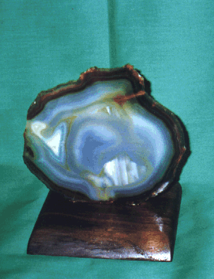 Creamy swirled pattern agate with fiery highlights on gracefully shaped base of walnut heartwood.