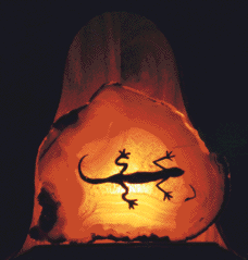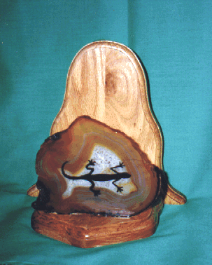 Gecko on butterscotch colored agate with circles of deeper colors. Base is high backed knotty oak.