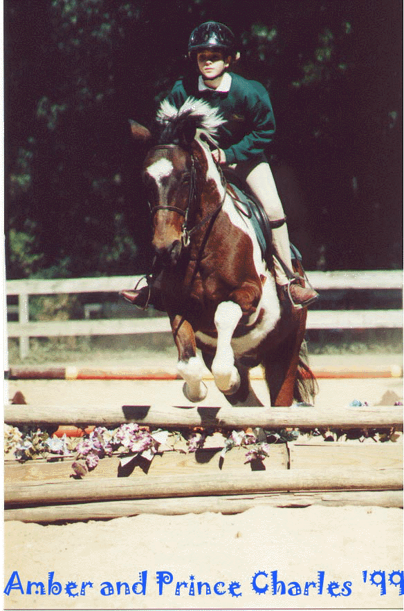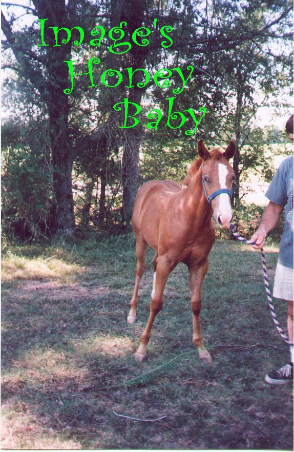 *The pic to the left is me and my lesson horse, Prince Charles (Charlie) at our last horse show at Shady Creek, October 99. My dad took that picture.* Well, As you've learned from the first page, I own a sorrel, QH/Paint yearling filly named Image's Honey Baby 'Honey'. I'm absolutely crazy about her. Lots of people ask how she got her name, well when she was born, her coat color looked just like Honey. So that's how she got her name. I board her at some stables called 'The Horse Hotel'. I guess I'll tell you about her horsey pals there too. Bailey- Honey's best friend/boyfriend. :) He's a sorrel 14.1 hand QH gelding that has the EXACT same markings as Honey does. On the face and the legs. It's REALLY weird. Bailey LOVES Honey. He always hangs over her and if the other horses try to come near her, he chases them off. It's really cute. Captain Chris- "Big Mac" as I call him, A 16.2 hand chestnut Tennessee Walking Horse gelding with no markings. He is very sweet and very friendly. He likes to be the center of attention and likes to roll in the mud and get dirty. Beautiful horse! Black Jack- A 14.3 hand black Tenn. Walking Horse gelding with no markings. He is shy and doesn't like strangers to be around him. He is nice once he gets to know you. Chance- A 16.2 palomino/white Paint gelding. He isn't very friendly. Not to me anyways. He is very pretty though. Paint colt- I don't know what his name is but he is SO cute! He's sorrel & white and is very inquisitive...and he likes to bite! Chestnut mare- Don't know what her name is either but she is the Paint's mother and she is gorgeous! Well, That's all of the horses at the barn right now. This barn has just recently opened so they are just getting started. Anyways, I'll have lots of pictures of these guys up as soon as I get the scanner going again. | |||||||||||||||||