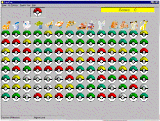 The Goal of the game is to capture all the Pokemons. You play simply by clicking on any Poke-Ball. If the Ball is adjacent to another one with the same color the Balls will disappear. All the balls above will drop down to fill the gap made by the disappearing balls. The White Poke-Balls are neutral and can be used with any color Ball. When all the Balls in a column have disappeared, the Pokemon on top will be beamed up to your Poke_Ball. Depending on the user Level, if you could not catch all the Pokemons in one screen, some of the ones that you captured will escape. You can always check how many Pokemons you have captured by selecting My-Pokemon from the menue or by clicking on your Poke-Ball. More interesting features are included in the full version. |
