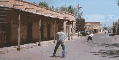 Rechts sieht man eine total berühmte Filmszene aus dem Klassiker "Pilly the trip", auch bekannt geworden durch den zweiten Teil "Für eine handvoll Shit". Über dem rechten angeschossenen Haupdarsteller, Sheriff Verzieht-keine-Miene-auch-bei-Dünnpfiff-nicht (René Rossol, „Sie nannten ihn Rossi"), im Duell mit Django MC (Michael Cremer, „La Boum – Die Fete") befindet sich auf der Ecke das Haus, in dem Billy the Kid verurteilt wurde, dann aber wieder fliehen konnte. |