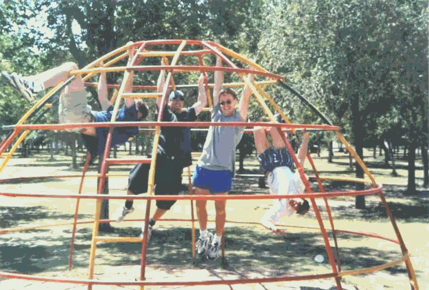 Besides my internship which was not also funny, exciting, challenging, awesome, lewd, different, the best ever and a very big step in my live, I had some leisure time, where I was just chillin’ or hanging out with my friends. Literally "Hangin’ in there": From left, Holger (after trying to hang down for 17 minutes - wait a second I’m not quit ready), me (master of all monkeys; overall-upper-chief-Utan), Michael (hangin’ like after the slam-dunk), Thomas (nearly smashed his head, but best second monkey-chango). In Parque- (Green-Lounge-of-Juarez-) Chamizal on a Saturday. Luckily it’s before the masses arriving, because every Monday looks like the Tiergarten in Berlin after 3,5 LOVE-PARADES. Not good, especially when you’re always passing by after crossing the border-bridge and going to work. In most cases our eyes are so narrow, because it’s Sunday, we do not face the crap. |