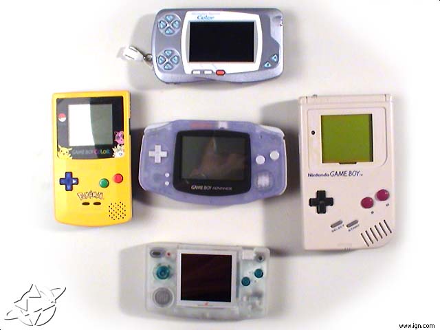 The Game Boy Advance next to a Game Boy color (left), Game Boy (Right), Neo Geo Pocket Color (top), and WonderSwan Color (Bottom). A good size comparison to other systems. As you can see, the GBA is about as big as a GBC turned sideways.