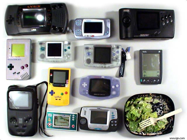 The Game Boy Advance next to many other handheld systems . . . and a salad?