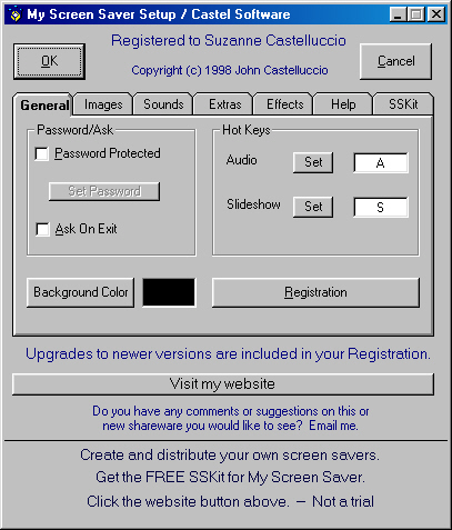 "Registration" If your version of My Screen Saver is earlier than 3.0 the registration button is not there and you need to download the newer version on my download page. To find out the version, click the About button on the setup screen. To register, simply go to my website, (see below) and follow the link on the Registration page. You can register by mail but it will take some time. To register on-line, you will need a major credit card. Simply complete the form and you will receive a code to enter into My Screen Saver. To do this, click the Registration button. Then enter the name that you used when you registered and the code you received. Click OK and that is it. No extra downloads. In the places where you saw the countdown of days of use left, you should now see your name. Note: you should check my website frequently, as I am not through with this program yet. I will be upgrading it and your registration does include the upgrades. Simply check your version against the one on the download page. If the version on the web page is higher, then you should download it. To keep your system clean, before you install it, you should use the Add/Remove option in your control panel to remove the older version. This will not affect your registration. It will remain intact. If you are happy with My Screen Saver, please tell your friends about it and give them my website URL, so they can download it.