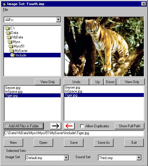"Open" This presents a selection box with all available Image Sets on your system. Select the set you want and click OK, or double click the file. This should include a Default set that comes with My Screen Saver. If you have done anything with the current data since it was last saved, you will be prompted to save it before it prompts you for the file.