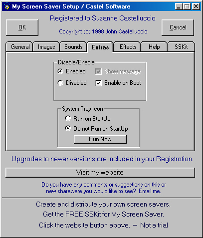 "Disabled" will stop My Screen Saver from running when Windows calls it. If you temporarily want to prevent any screen saver from running, you would normally have to go into the Windows Control Panel and select none as your screen saver. This option let's you keep My Screen Saver selected there, but will disable it until you enable it again or reboot, if you select that option. If you've ever had a screen saver start at an inopportune time, you'll know why you might want to do this. This and the Enable option are also on the System Tray Icon menu.