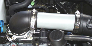 Remove the main intake resonator and put in it's place a 7.5" long 2.5 inch in diameter thin-walled flared-ended PVC pipe. It should look like this when your done: