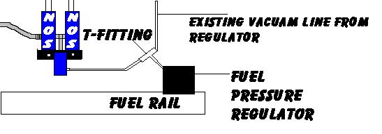 Once the solenoids are mounted next step would be to run the 16' nitrous line. This is the line that connects the bottle to the solenoid. Now remeber to use either teflon tape or teflon paste when sealing this connection. If this is not connected tightly enough when the bottle is opened the nitrous will leak out. DO NOT open the bottle till the entire installation is complete. The next step would be to connect the T-fitting to the Vacuam line of the fuel pressure regulator. The fuel pressure regulator can be found on the fuel rail, for those who do not know where his is it is the chrome tube right above the valve cover. It is a Black box, sort of, well it looks like a block with electrical wires on top of it. Now on the back of the fuel pressure regulator there is a thin black tube that points torwards the firewall. This is where the t fitting goes. Below I have drawn a terrible but legible drawing of how the t fitting should be inserted