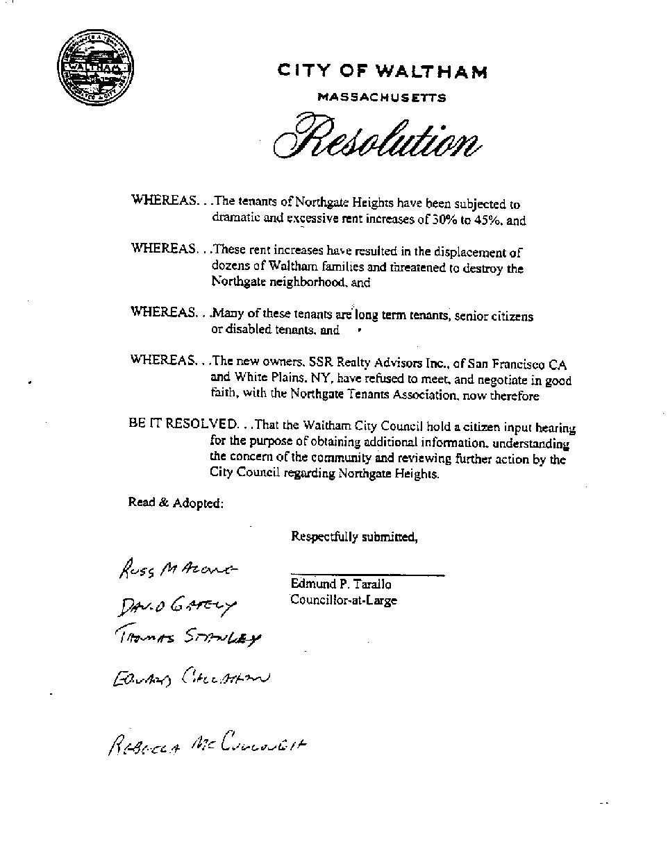 May 24th: The NHTA was at a special City Council Citizen Input Hearing for the purpose of addressing the rent increase situation. Several Northgate residents spoke about the hardships imposed by the enormous rent increases and how difficult it is to find more affordable housing. David Kaplan eloquently addressed the Council in his effort to explain the overall situation and the effect it has had on our community. There were thirty-five Northgate residents in attendance while only Mr. Dacey, spoke on behalf of his client. Jeffrey J. Morris, Managing Director of Metric Property Management (the company managing Northgate Heights) was unable to attend due to bad weather conditions along his flight route from Atlanta.