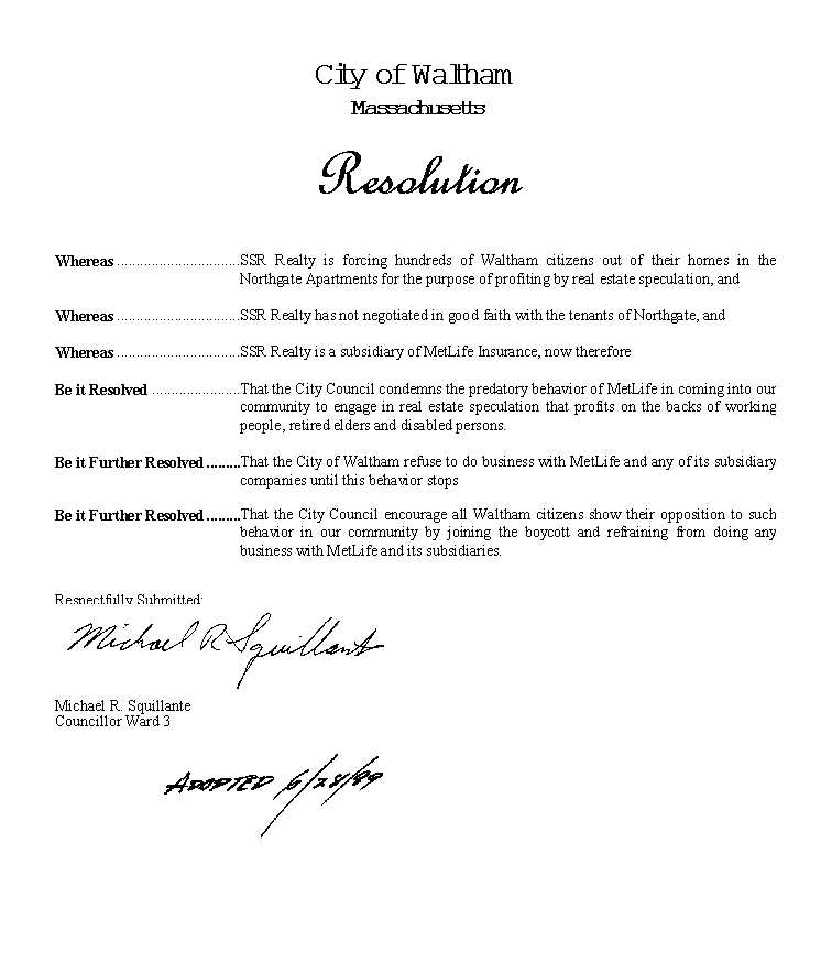 June 28th: The last of the signed letters were delivered to the City Council on their last meeting prior to the summer break. At that meeting, the resolution which was sponsored by Michael Squillante, was passed by an overwhelming margin, sending a strong message to MetLife. In short, The Waltham City Council: