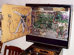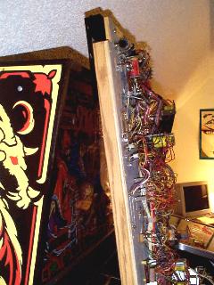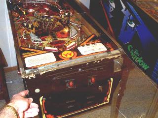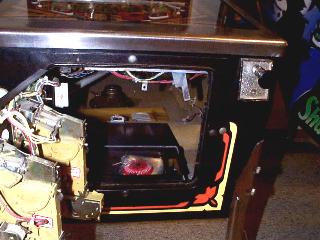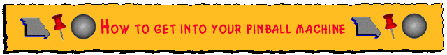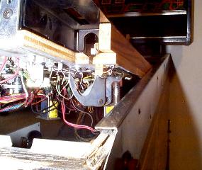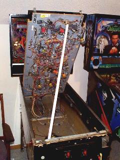 Newer machines will have metal pivot point and will swing up quite easily. Watch that the top of the playfield does not get caught on the wires running to the backbox. Older machines generally have some type of shelf that supports the playfield on each side. Take more care raising these since there is really nothing keeping the playfield in the machine other than the wires running to the backbox. A metal bar, usually on the right side of the cabinet, it swings up and hods the playfield up. There should be a slight indention in the playfield for this bar to rest in. This bar does NOT give the playfield enough support. You have two options. The first is to tilt the playfield up all the way so that it leans BACK against the backbox. Take it slow and be sure that the playfield is secure before you let go of it. The second choice is to have a rod about 4 foot long (plastic conduit or a short pool cue works fine) and place one end in the bottom of the cabinet near the coin door and the other end secured to something in the center of the playfield. Be careful not to bend anything and that the playfield will stay put. The playfield will usually slide sideways an inch or so till it is caught between the side of the cabinet. |