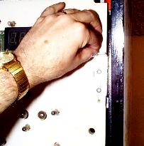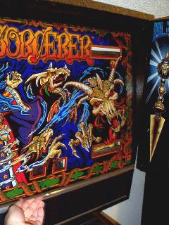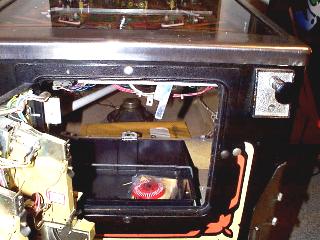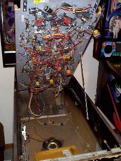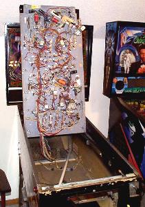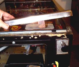 | Remove the playfield glass. Lift straight up on the bottom metal arch (the part that hides the ball return mechanism). With the playfield lifted a few inches, find the ball kick-out mechanism and with you hand, flip the balls out into the shooter lane. Place the balls in a safe place off of the playfield. Carfully lift the playfield up to about chin high and look under the playfield and determine how the playfield is supported. |