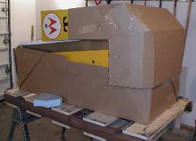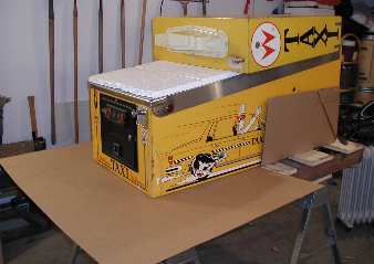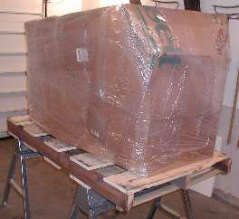 The pallet that I used was one that I had received a pinball machine on. The pallet is 58 inches long, 33 inches wide and 5 inched thick (2 x 4's with 1x8's screwed in place). Pinball machines are roughly 30" wide (facing the backglass), 76" to 80" tall and about 56" deep. Folded with the legs removed they are approximately 30" x 30" x 56". Everything was removed from inside the machine. The coin door and back box were locked. Keys, bolts, extra parts, bulbs, balls and the manual were packed into the coin box. I laid a piece of Styrofoam on the backglass and I put small pieces of soft foam on top of the Styrofoam to support the translite and a second piece of soft foam to support the speaker panel. Then the back box was folded down. The cardboard was cut out from the corners allowing the corners to fold around the cabinet with a double layer of cardboard for protection.