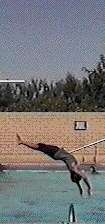 The diver goes up just like a good diver should but bends his knees and should only bend at the waist.
