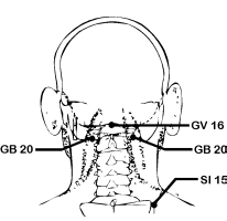Benefits: relieves mental stress and insomnia. GB 20: (FENG CHI) WIND POND