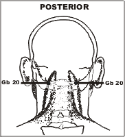 Use your thumbs to gently push into the GB 20 points on both sides of the base of the skull at the same time. Allow your head to tilt back slightly as you support the weight of your head with the thumbs.
