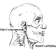 Hold TW 10 on the left side with the right hand while the left hand holds TW 17. Breathe into the points for a minute or two and switch sides. This is a good way to help ease off that tension in the sides of the neck and jaw.