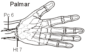 Location: On the inner wrist at the outer part of the arm. This point is in the groove between the tip on the arm bone and the hand bones.
