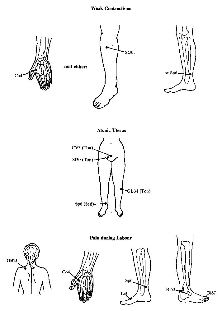 The object of all these points is to regulate the Qi, move the blood, and strengthen the contractions.