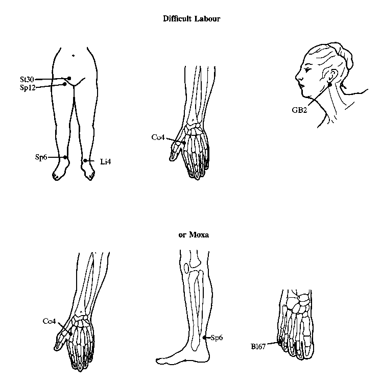 In cases of difficult labour, stimulate Spl2 (Chongmen), Li4 (Zhongfen), St30 (Qichong), Co4 (Hegu), Sp6 (Sanyinjiao) and Gb2 (Tinghui), or moxa Co4 (Hegu) and Sp6 (Sanyinjiao) and burn three cones on Bl67 (Zhiyin).