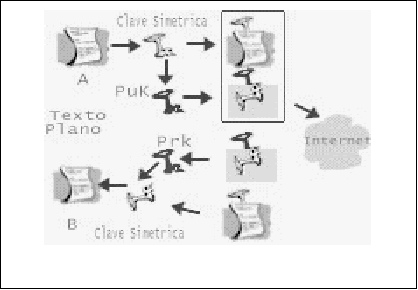 Cuando B recibe el mensaje cifrado, lo descifra con su clave secreta. En realidad, el proceso de cifrado usando clave publica es mucho más lento que el sistema de clave simétrica, por lo tanto, lo que se hace es encriptar con un sistema de cifrado simétrico como DES, y luego, se cifra la clave simétrica con la clave publica de B y se envía junto con el mensaje cifrado, en el receptor (B), utilizando su clave privada descifra la clave simétrica y con esta última el mensaje.