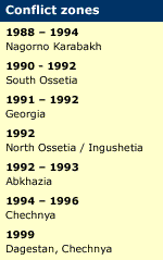 The Russian empire spread south of the main Caucasus mountain ridge at the end of the 18th Century, but highlanders on the northern slopes continued to fight for several decades. Russia's eventual victory led to the flight of thousands of Circassians from the western end of the mountain range. Countless numbers perished en route to Turkey. This mass movement of people was repeated by Stalin's deportations in the 1940s. The Chechens, Ingush, Karachai and Balkars, among others, were deported en masse to Central Asia. These episodes are deeply imprinted on Caucasian historical memory. At the same time many Caucasians look back fondly on a brief period of independence at the time of the Russian Revolution. Some are still waiting to re-live it. | |||