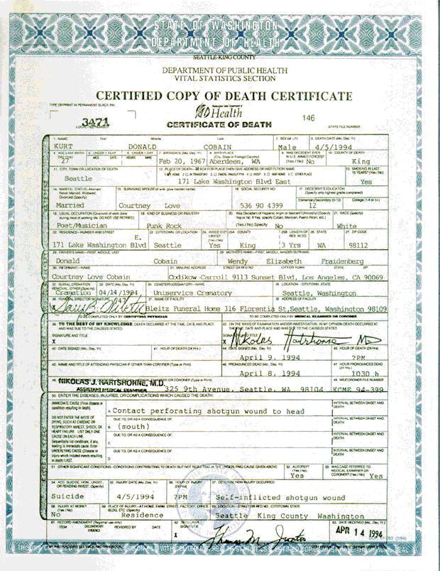 Certidão de óbito - Kurt Cobain