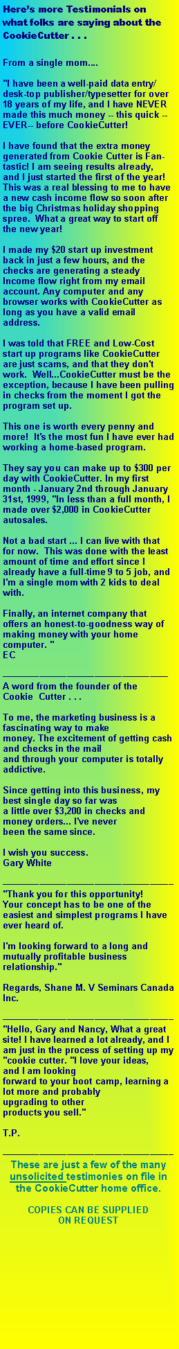 semi-automated cookie cutters producing checks for you. This is the dream that has drawn so many thousands of aspiring entrepreneurs to the World Wide Web. And IF YOU KNOW WHAT YOU'RE DOING, it can become a REALITY!