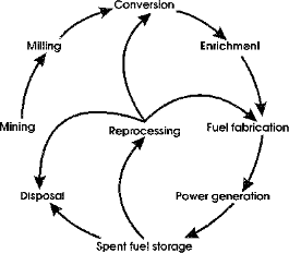 The cycle associated with Uranium is a complex one. Many stages are involved, and many steps within each stage. It follows roughly the following pattern :