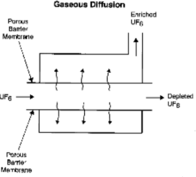 Gaseous diffusion is performed by passing the Uranium hexafluoride, containing both U-235 and U-238 isotopes, through a narrow passage lined with a barrier which has billions of pores per square centimetre: