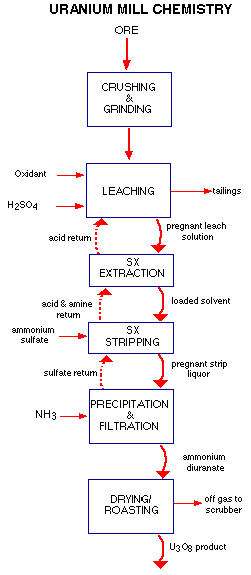 The first step in the milling process is to purify and concentrate the Uranium, making the rest of the milling process more more efficient. In order to achieve this, one of two methods can be used. The first, ion exchange, involves using other chemicals of the same electrical charge to replace undesirable elements within the Uranium compound. The second, and more effective method of purification, solvent extraction, is a continuous process using tertiary amines to react with the Sulphuric acid , yielding an organic compound, as demonstrated by the following reaction: