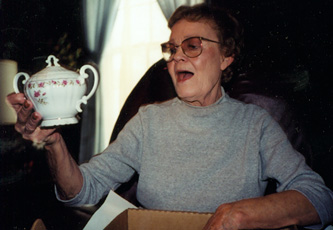 ![]() (above) This is my grandma Booth. She has just opened the Christmas gift I sent her. She re-wallpapered in the kitchen with teapot wallpaper and she wanted some real antique teapots and other containers for the rack on around the top of the cabinets. I wasn't able to be there, so my mom took a picture of her reaction for me.