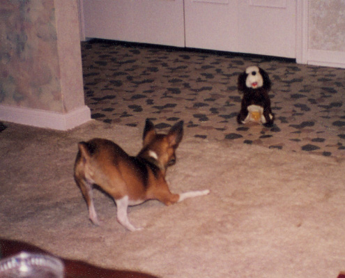 The picture below is of her with one of those barking, battery-operated dogs. She's not a big fan of it, but we get highly amused. (We only do it every couple of years - don't worry).
