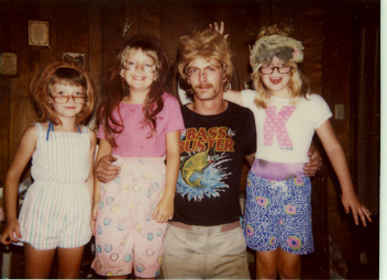 (left to right) This is a picture of my cousins Nicki, Clysta, my uncle Randy, and me. We each put on one of Grandma's wigs and Grandpa's reading glasses. We had fun that day!
