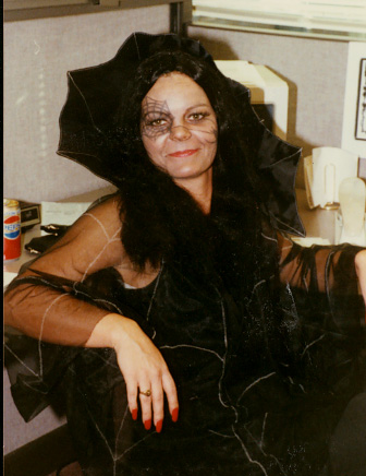 This is a picture of my mom, Valerie. Her office had a halloween party. As you can see, she has a spiderweb on one eye and a spider on the opposite cheek. I actually remember helping her come up with ideas for the face decoration.