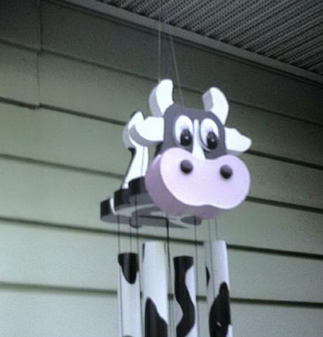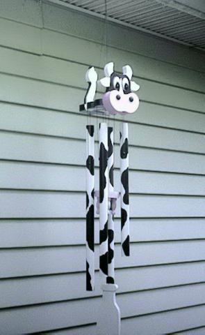 Udderly adorable. Listen to the beautiful moosic of the cow chimes. For cow lovers of all ages, these chimes are hand-painted solid wood. Aluminum tubes and a wooden clapper create mellow tones. The longest tube is 22 inches long; the cow is about 10 inches long. Plastic eyes 3-D eyes. (Note that the picture does not show the word "Milk" printed on the wooden milk bottle at the base of the chimes. This now appears on both sides of the milk bottle.)