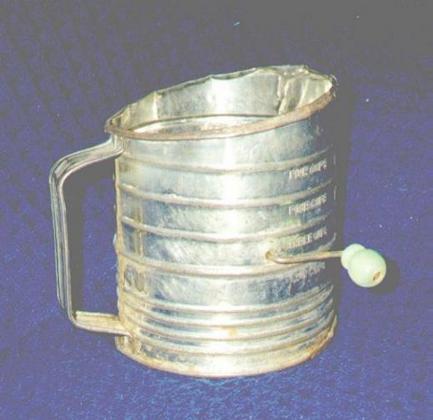 1.80 year old Bromwell's metal Flour Sifter.6" tall x 5" in diameter. 4 Sifting wires and Turning knob. Measures from 1 to 5 cups.