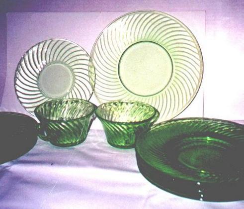 3.Green Pressed Glassware. 5 Plates, 6 Saucers and 2 Cups.