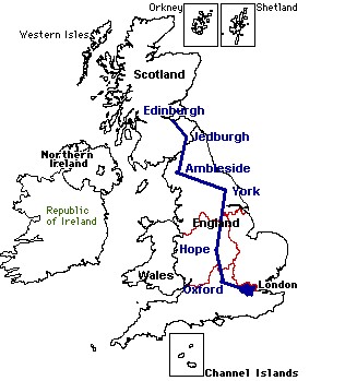 Below is a map of the first leg of my trip in the United Kingdom with the route we took from London to Edinburgh marked in blue.