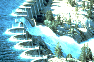 Hydroelectric power uses the kinetic energy of moving water to make electricity. Dams can be built to stop the flow of a river. Water behind a dam often forms a reservoir. Dams are also built across larger rivers but no reservoir is made. The river is simply sent through a hydroelectric power plant.