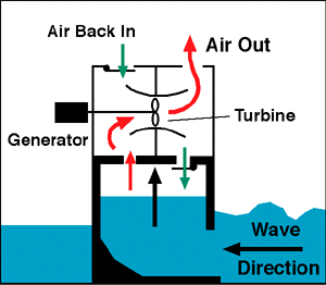spins a turbine which can turn a generator.When the wave goes down, air flows through the turbine and back into the chamber through doors that are normally closed.